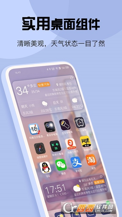 桌面天气:提供多种不同大小不同内容的桌面插件,多种内容、多种颜色、多种尺寸,实时天气在手机桌面即可查看,自动更新