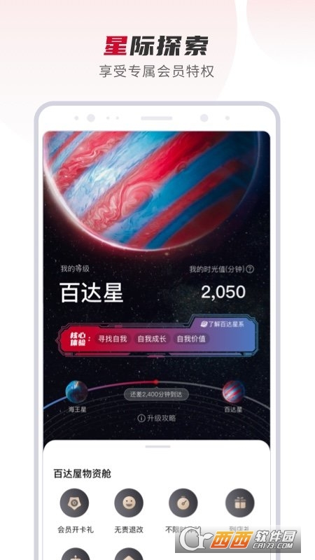 在百达星系,您以“星际漫步者”的身份,从地球(初始等级)出发,去往月球、火星、海王星、百达星以及更远的浩瀚星辰。在百达星系度过的每时每刻,以后都能换算成具体可享受的权益。德胧旗下划时代的基于时空体验的全新会员体系,