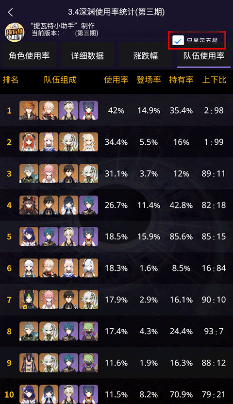 1、首先打开提瓦特小助手官方正版,在更多功能模块点击队伍使用率排行;