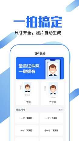 1,常规的图片从一寸、二寸到小一寸等等不同的画面模式都可以更加简单的进行选择,白底到红底到不同大小的证件照都可以来进行设置,自动锁定拍摄效果。