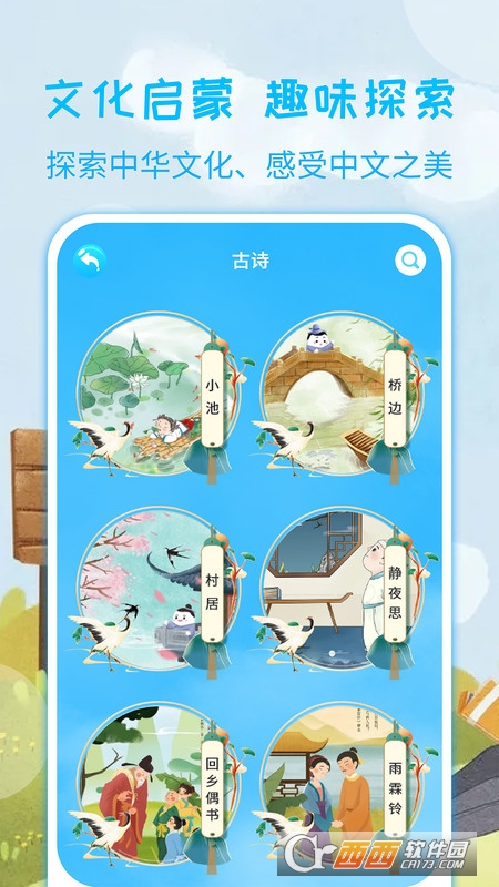古诗学习:精选幼儿必读经典诗词,配有精美场景和专业朗诵示范,让孩子爱上古诗。