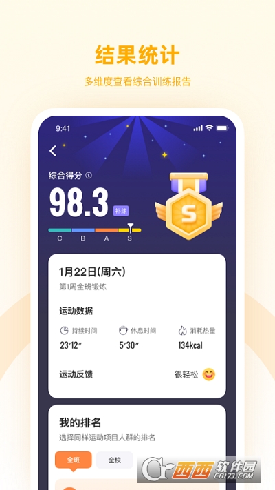 热门项目、组合训练、自选运动,快来挑选你喜爱的运动吧!运动结果查看查看包括运动时间、消耗热量、智能测分等多维度的锻炼报告,还能查看和全班全校同学的锻炼对比以及每个动作的表现详情。