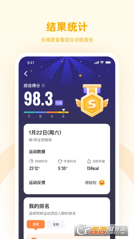 查看包括运动时间、消耗热量、智能测分等多维度的锻炼报告,还能查看和全班全校同学的锻炼对比以及每个动作的表现详情。