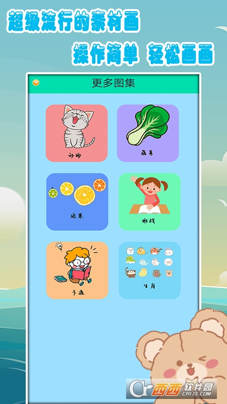【多种风格】我们拥有超级流行的素材画,有动物,蔬菜,水果,挑战,卡通,生肖等各种素材任选,操作简单,轻松画画,每个素材下面多有非常多的图片元素哦!
