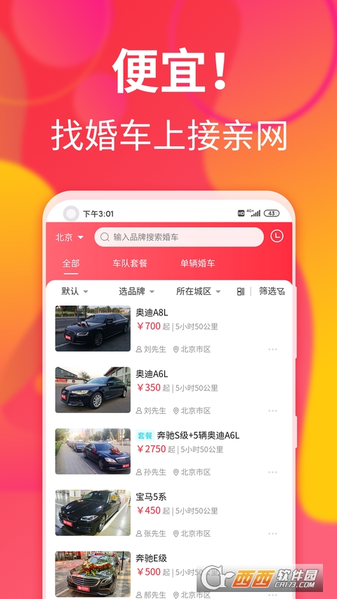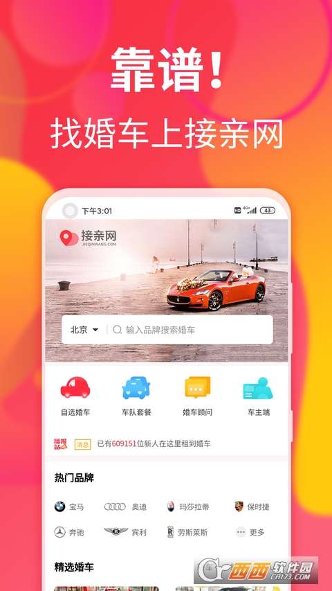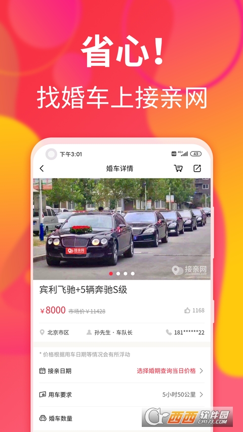 接亲网是覆盖全国的婚车共享租用平台,接亲网婚车是一款基于移动互联网的婚车服务平台软件,车主在平台上按要求发布车辆,平台审核通过后直接面对接消费者,省去了中间差价让利于有婚车需求的新人,同时平台执行行业领先服务标准让新人放心订车,始终以“用户体验至上”为目标。