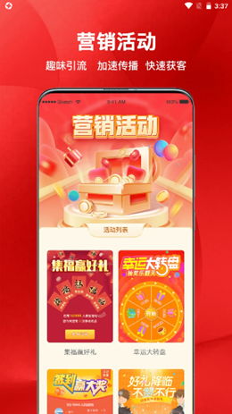 红促宝商家端app是一款在线将不同类型的促销服务模式进行设计和开发的综合办公软件,主力的职能在于可以帮助用户进行引流模式的开发,能够更加简单的来进行建立设计专场的营销模式内容,无论是抽个奖还是大转盘等等,各种活动都可以吸引客户。