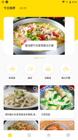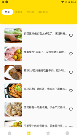 2,所有的菜谱覆盖了非常完善的内容,从家常菜到面试到早晚餐都有,对于自己喜欢的菜谱还可以进行收藏,学会制作更加精美的菜谱。