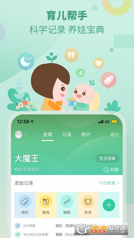 方便记录:最简单的操作,记录宝宝的饮食、睡觉、排便和成长情况。