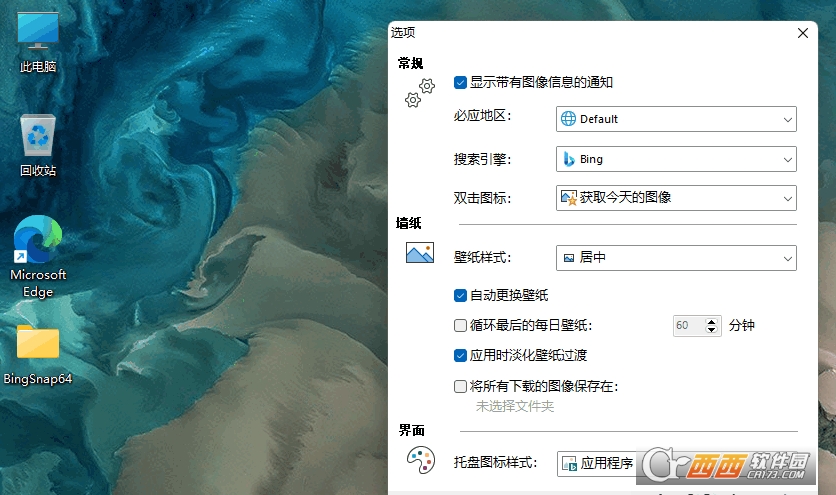除了自动设置为壁纸,BingSnap同时还具有自动保存必应图片文件到指定本地文件夹的功能,想要实现这个,只需要点击BingSnap系统托盘菜单中的【options】菜单项,在跳出的界面中勾选【save all downloaded images in:】,并在下方设置文件夹路径即可。