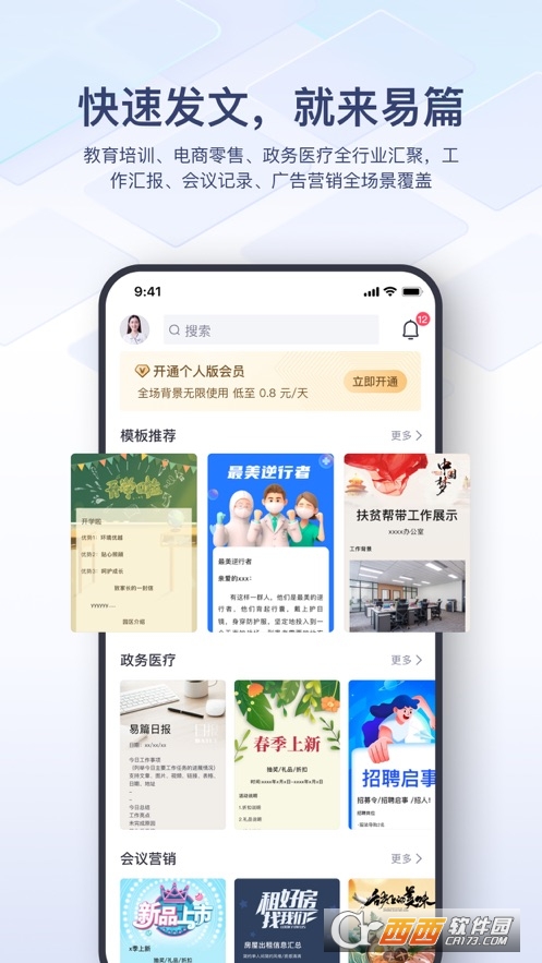 「易篇」是专为工作场景打造的长图文发布工具。我们为你准备了开学通知、活动记录、防疫指南、消防安全、工作汇报、年终总结、开业通知、招生招聘等海量工具场景范文模板,制作完成轻松分享微信好友和朋友圈,让繁重工作轻松搞定。