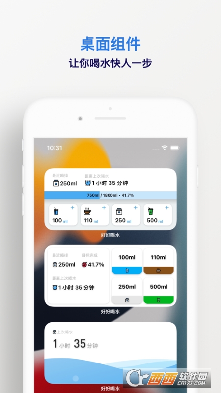 好好喝水是针对个人用户所推出的一款提醒方面的工具,对个人用户进行提醒,让用户能够知道好好喝水,每日保持一定的饮水量能够尽可能的减少通风等病症的发生,极简的界面、好看的小组件这些都是其它的喝水提醒软件所不具有的,需要的话就快来下载这款好好喝水!