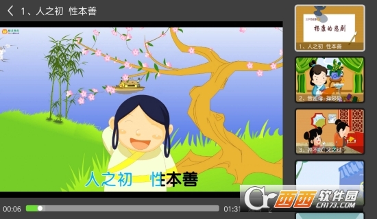 常言道:“熟读《三字经》,可知千古事”,古代儿童都是通过《三字经》来识字学理的。如“昔孟母,择邻郊”,说的就是孟母为了让孩子有更好的教育环境,三次搬家的故事。以故事的形式解读《三字经》,让孩子在兴趣中接受启蒙。