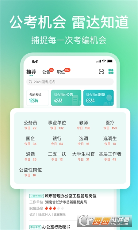 公考雷达是一款非常权威的公职类考试信息整合平台;这里汇聚了种类繁多的各类招考公告,实时为你推送最全面的全国公考职位信息,能帮助你快速找到适合自己的职业,也能随时关注每一次公考考试哦!公考雷达,天天都有好职位。