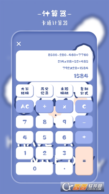 【计算器】保留历史计算数据的日常计算器,计算结果可一键转换大小写,可一键复制表达式,方便用户的操作,尤其是在计算结果较大的情况下。多种可爱皮肤随心切换。