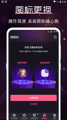 3,独特的更换图标的功能可以让用户自己将手机内部的程序进行更改和自定义名称,轻松的转换,手机个性化设置更高级。