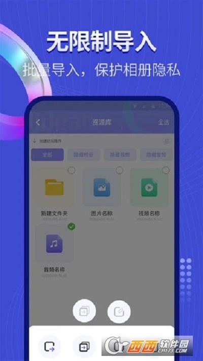 【图片隐藏】支持一键从手机相册导入视频和图片,支持单选和多选。导入照片保险箱后,手机相册中的图片和视频会自动清除。