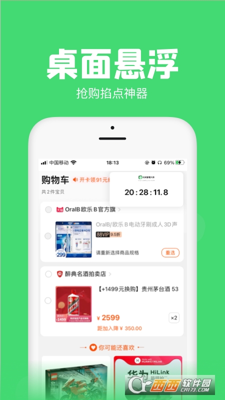拥有两种悬浮模式,时钟模式和倒计时模式。可以在任意APP上悬浮,秒杀必备神器!