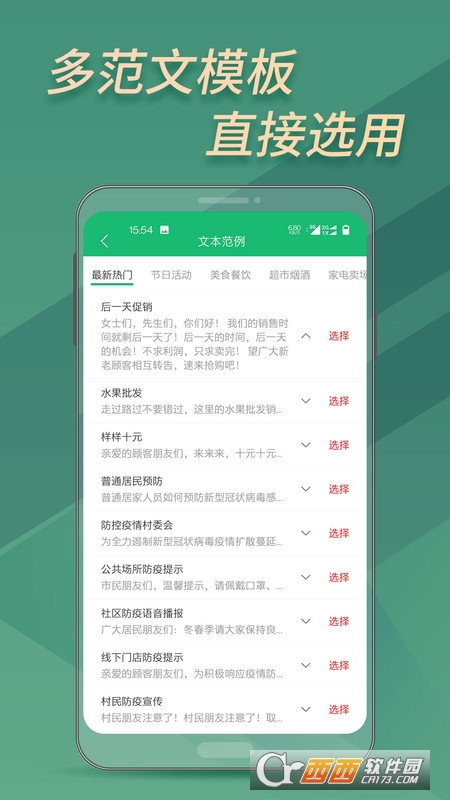 提供多套文本范文,选择修改使用,包括:最新热门、节日活动、美食餐饮、超市烟酒、家电卖场等。