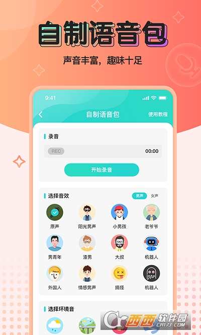 2.多种变声效果可选:爷爷、大叔、小孩、幽灵、机器人...... 变声时只需轻轻一点,让你成为自带BGM的潮人