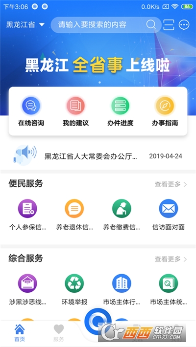 黑龙江省政务服务app(黑龙江全省事)是一款专为黑龙江省设计的便民政务服务平台,全新黑龙江全省事上线,包含了在线咨询、我的建议、办件进度和办事指南等内容,拥有便民服务、综合服务等服务分类,可以随时输入内容搜索了解,需要的伙伴,来鳄斗163手游网即可使用哦!