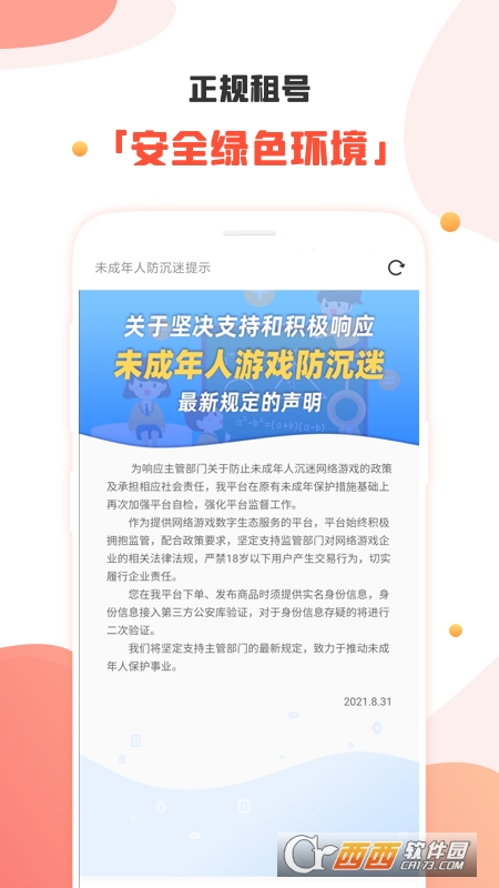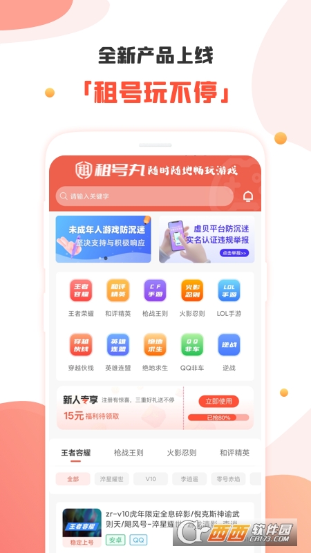 租号社app是一款专门为游戏爱好者开发的游戏租号服务平台,平台上面汇聚了王者荣耀、英雄联盟、和平精英、原神等多款热门游戏账号的租赁,同时还可以了解最新的游戏资讯,有第三方作为监管,租号更加安全放心,需要的可以来鳄斗163手游网租号社app进行使用