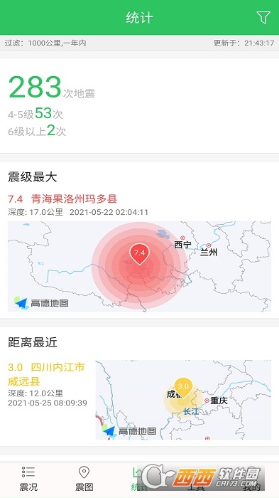 3、地震统计:统计指定时间段和范围内的历史地震记录,了解不同震级发生次数、离您最近的地震和震级最大地震。
