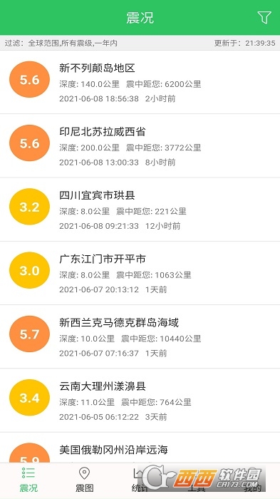 1、实时查询:通过列表和地图的形式展示全球范围内最新地震讯息,可以筛选地震范围、地震时间和地震震级。
