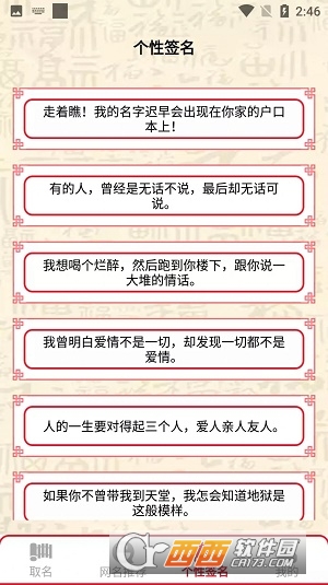 整个软件的页面设计非常的简洁明了,给用户带来的使用体验感绝对会非常不错的,让你轻松到获取到专属于你的姓名,除了起名字等相关服务之外,还有个性签名以及网名推荐哦,你可以选择性的进行查看。