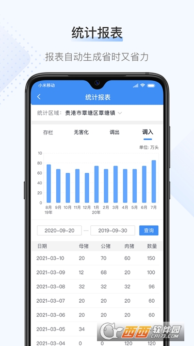 实时显示区域养殖数据,存栏数、调入数、调出数、死淘无害化数多维数据展示,支持条件筛选,你要的都有。