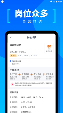 1,优质的岗位情况分类说明了具体的职位人数以及工作的情况,锁定招聘范围的日结工作会有详细的工作时间,招聘兼职更加简单直接。