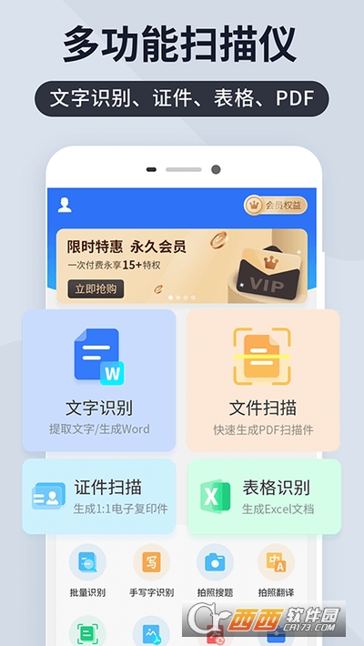 支持扫描各种文件、图片、拥有强大的OCR文字识别技术,支持多语言翻译,智能剪裁文档边界,移除杂乱背景,识别结果自动分段,会员+无限次数!