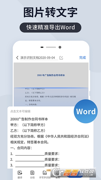 * 扫描识别各种文件、图片、书籍、名片等并提取想要的文字,可对识别的内容进行编辑、复制