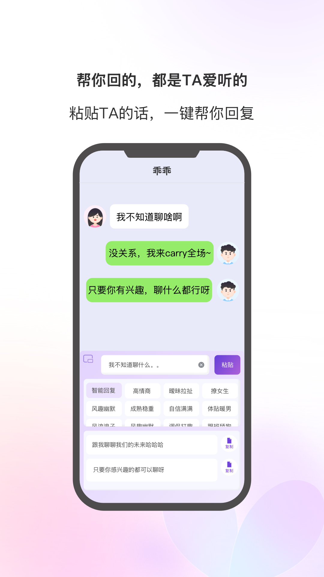 一键搜索回复妹子说的话,智能分辨话术,语义搜索答案,帮助男生解决尬聊问题。