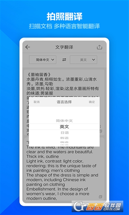 【拍照翻译】直接翻译拍摄图片或相册图片中的文字内容,支持27种国家语言,您可随意编辑、保存、一键分享微信、qq。