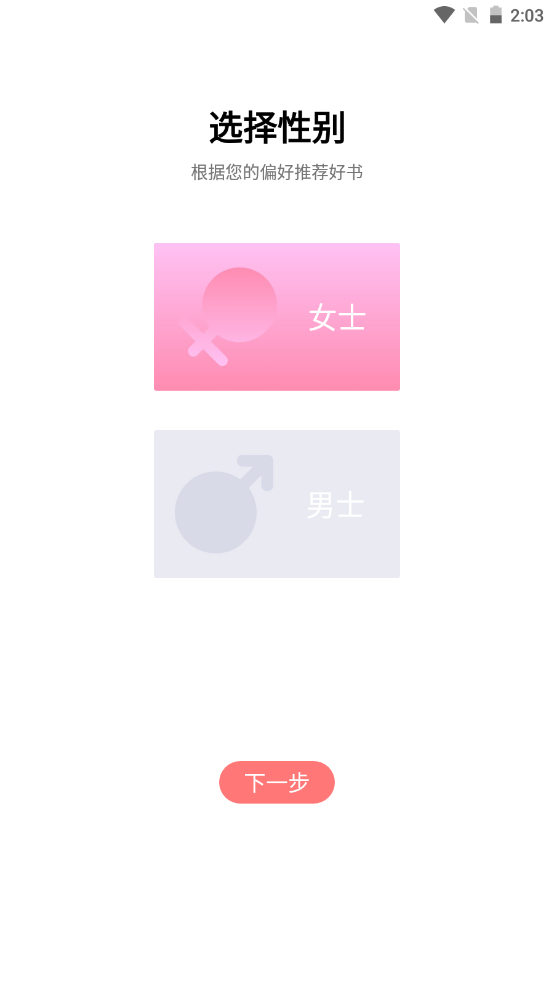 1、进入软件之后我们就可以进行选择,选择自己是男生还是女生,选择自己喜欢什么样子的小说,我们也会主动推送小说哟;