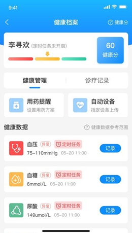 3,健康管理的用药更新,设定时间之后就可以进行准确的数据上传,并且会为用户提供诊疗记录,合理的安排自己的生活。