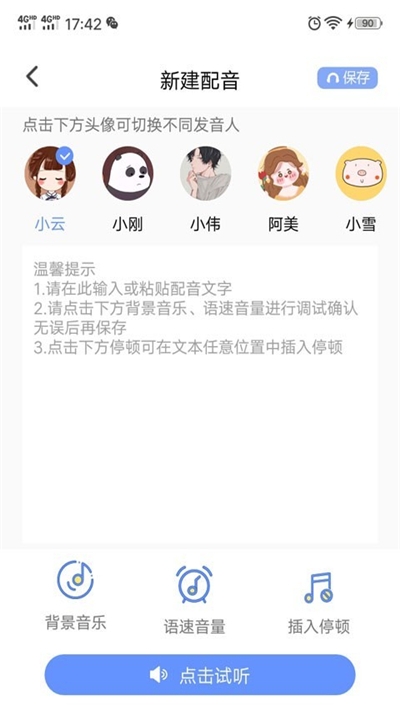 多个配音人,包括男声、女声、童声,可随意切换调整语速音调