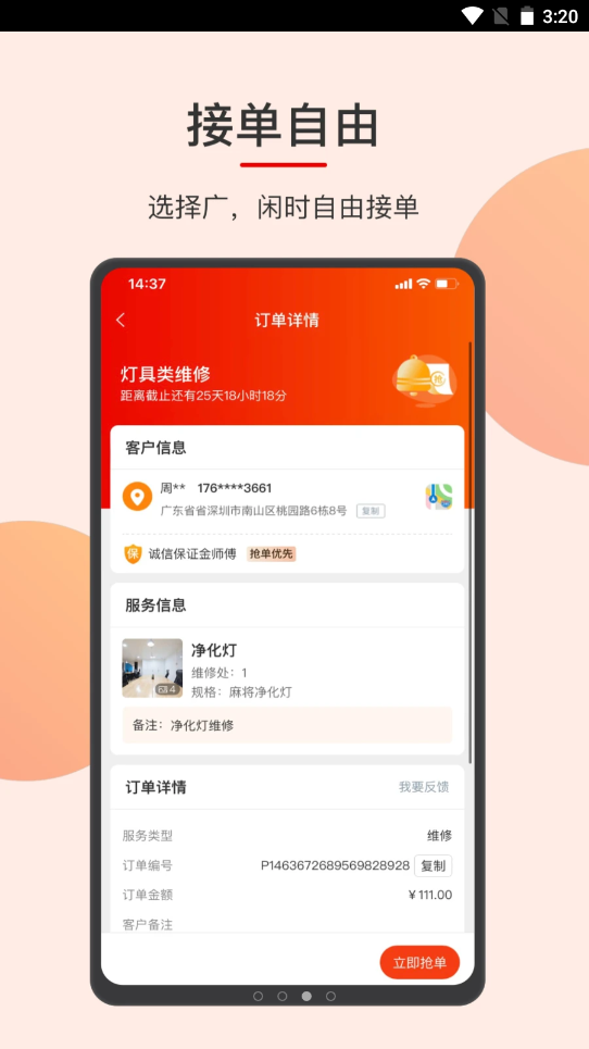 2、我们这里将会看到各种各样的优质订单信息,及时在平台上进行订单的管理,将每一个订单都物尽其用,用心做好每一次服务;