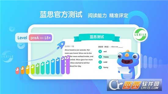 1、通过平台内置的蓝思在线测试,准确评估学生阅读能力,为学生制定个性化英语阅读方案。测试题目不重复,可多次进行,体现阶段进步。