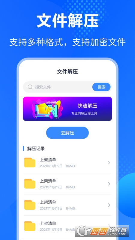一款强大高效的压缩和解压缩工具软件,集合了文件管理、文件分类、压缩、解压缩及文件转换万能小工具。支持多格式压缩和解压缩;支持 ZIP, RAR, 7Z, TAR, ZIPX, GZIP, BZIP 等多种压缩文件格式。操作简单方便,是一款高效的手机压缩和解压缩文件管理工具。