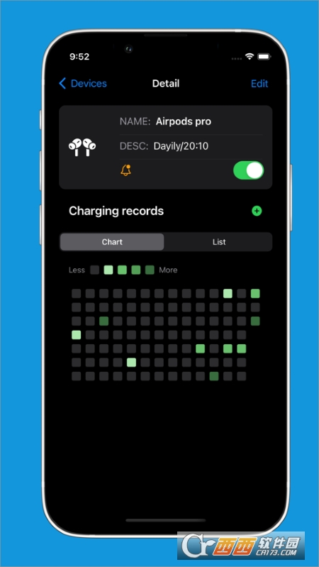 给它电是一款数字设备充电提醒App,如今我们有各种设备需要按时充电才能正常使用,作者经常忘记给自己的电动牙刷,耳机,刮胡刀之类的产品充电,导致经常用的时候才发现没有电。为了解决这个问题特意做了一个App,希望这个App能帮助到和我一样有此困惑的朋友。另外电子设备的电池也是消耗品按时充电可以延长电池的使用寿命。