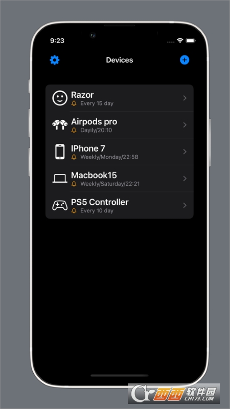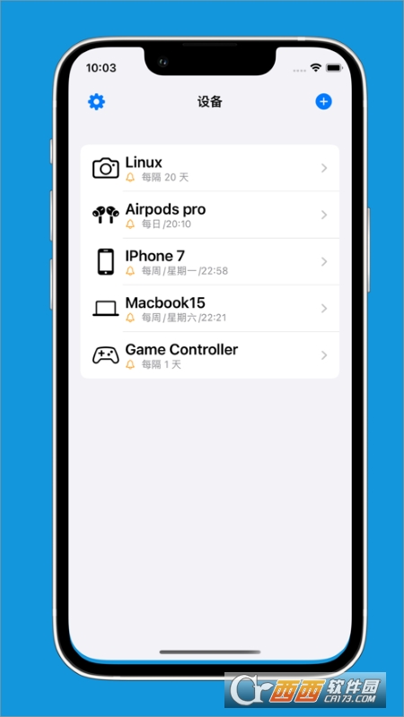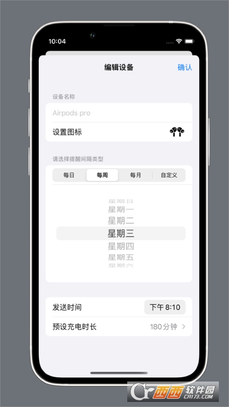 首先把需要充电的设备都添加到设备列表,并根据它的电池续航能力设置充电提醒的日期间隔。日期间隔现在有4种类型可以选择:每日/每周/每月/自定义天数,其中自定义天数无法精确到时间点(其他的都可以);