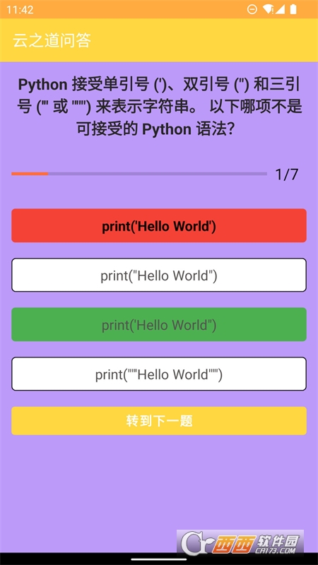 每个测验都包含Python一系列带有四个答案选项的问题,而你只需要从中选择一个正确的答案。选择答案之后点击下一步就可以知道当前问题的答案结果。