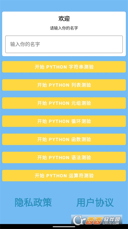 云之道问答是一款专业的Python测验服务软件,在这里拥有的测验项目丰富,输入你的名字,任意选择各种项目,包含了字符串、列表、元组、函数和语法等测验,操作方法简单,轻松进行相关问答,更有详细的解析,鳄斗163手游网即可安装使用哦!