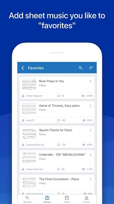 将您真正喜欢的乐谱添加到收藏夹,以快速访问这些乐谱,并学习演奏它们!