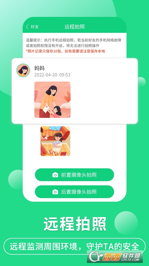 • 远程拍照:通过手机前置、后置摄像头拍照,时刻掌握亲友周边环境情况,保护TA的安全;