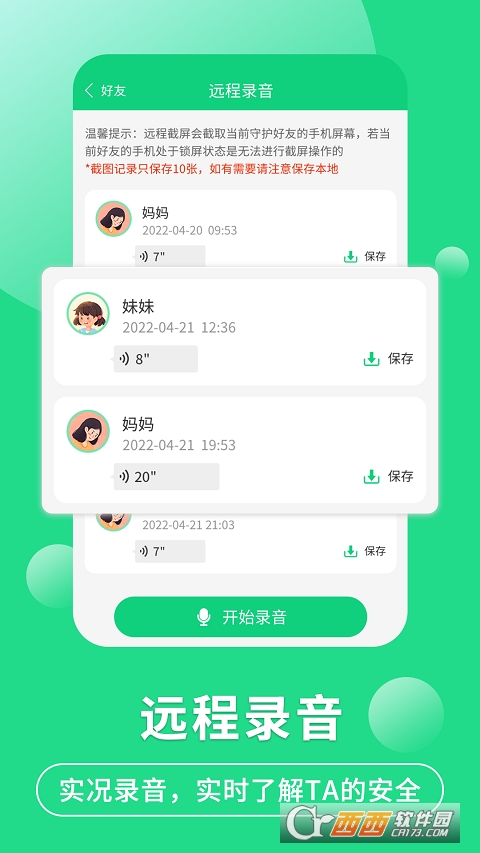 • 远程录音:通过手机远程录音,时刻掌握亲友周边环境情况,保护TA的安全;