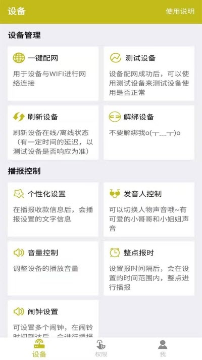 该应用主要用于控制设备播放收款信息、闹钟、整点提醒等,并且支持LED灯显示收款信息、自定义广告文字、天气数据的功能,还可以切换发音人哦。