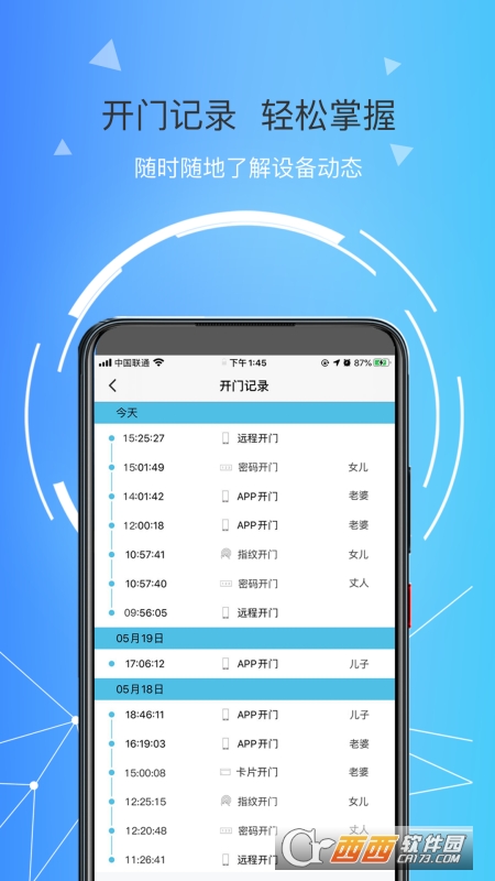 琨山智能是一款智能门锁管理服务软件,帮助用户绑定门锁设备,进行实时管理,可以记录每次开锁关门记录,随时可以查看出入情况,还可以知道门锁使用电量状况,需要的伙伴,鳄斗163手游网使用吧!