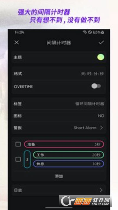 间隔计时器: 将多个计时器拼接组成一个功能强大的计时器。该计时器会在每个计时器开始的时候发出警报,并在计时完成的时候,自动开始下一个计时器。该计时器时候锻炼的时候使用。